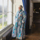 The luxury teal fine wool satin cocoon coat, designed to keep you warm at home, is filled with British wool and expertly quilted in the North of England.